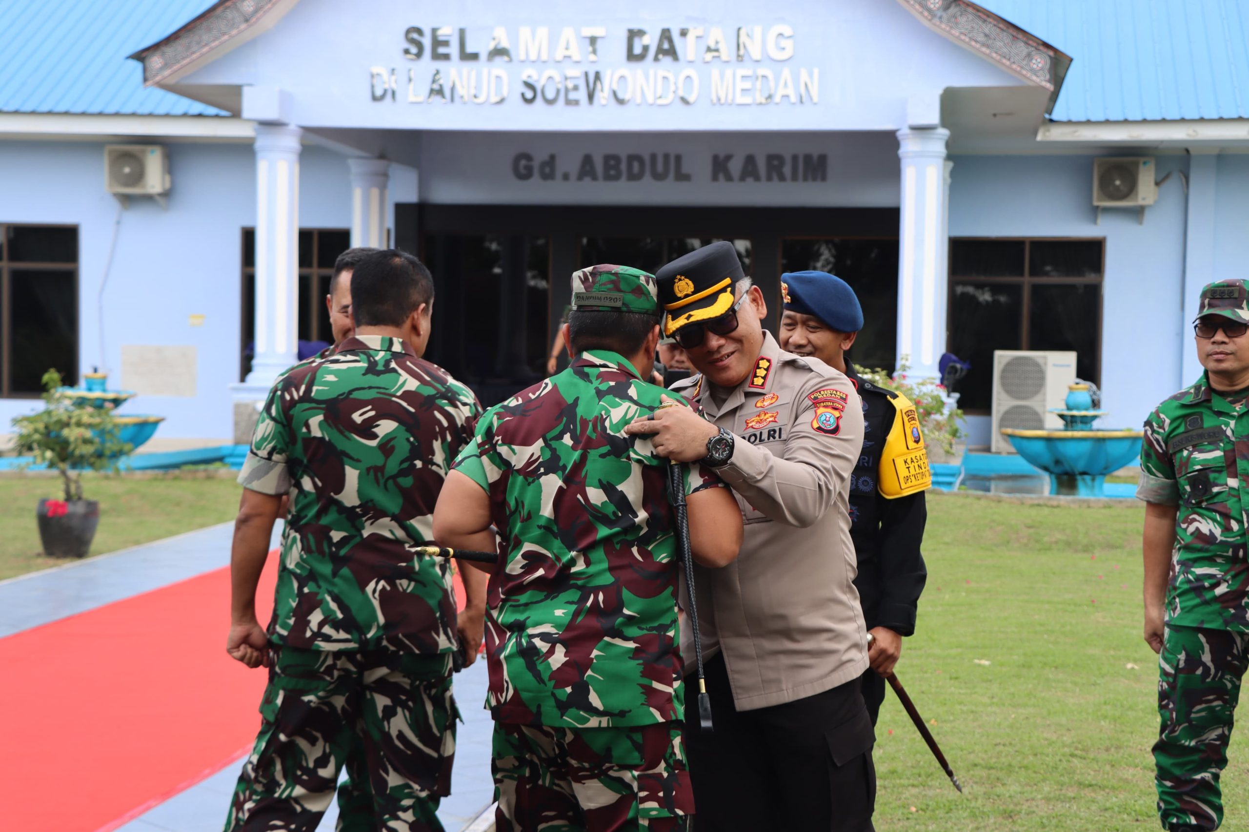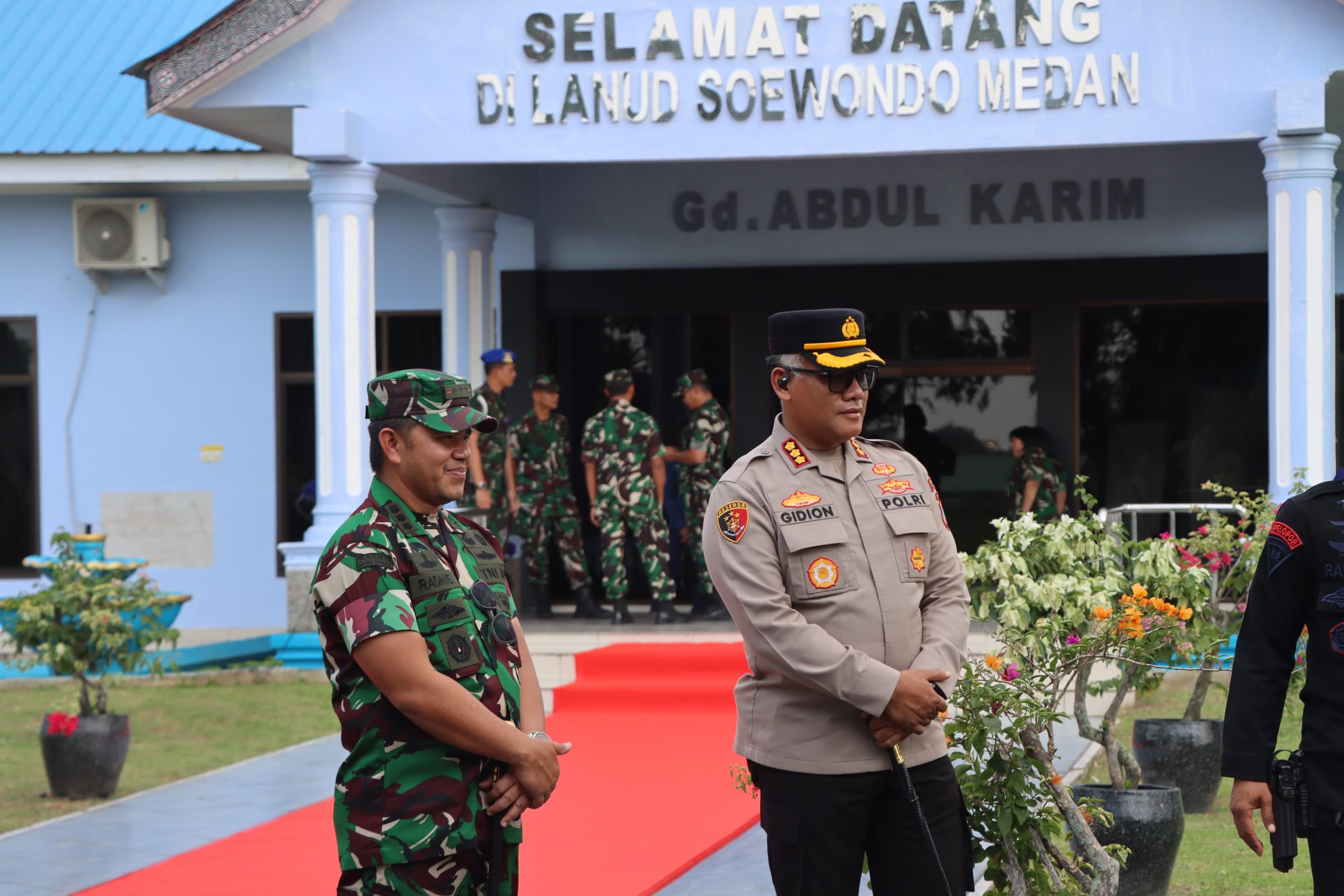 Kapolrestabes Medan Kombes Pol Gidion Arif Setyawan ikut sambut kedatangan Menteri Pertahanan RI, Senin (24/3/2025) sore.