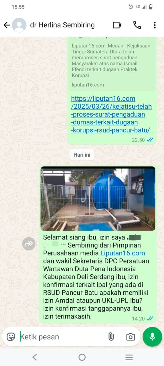 Terpisah saat dikonfirmasi awak media ini melalui pesan WhatsApp ke no nomor +62 813-7519-xxxx Jumat (28/3/2025), Direktur RSUD Pancur Batu dr. Herlina Sembiring pesan whatsapp masuk centang dua biru tapi tidak membalas.