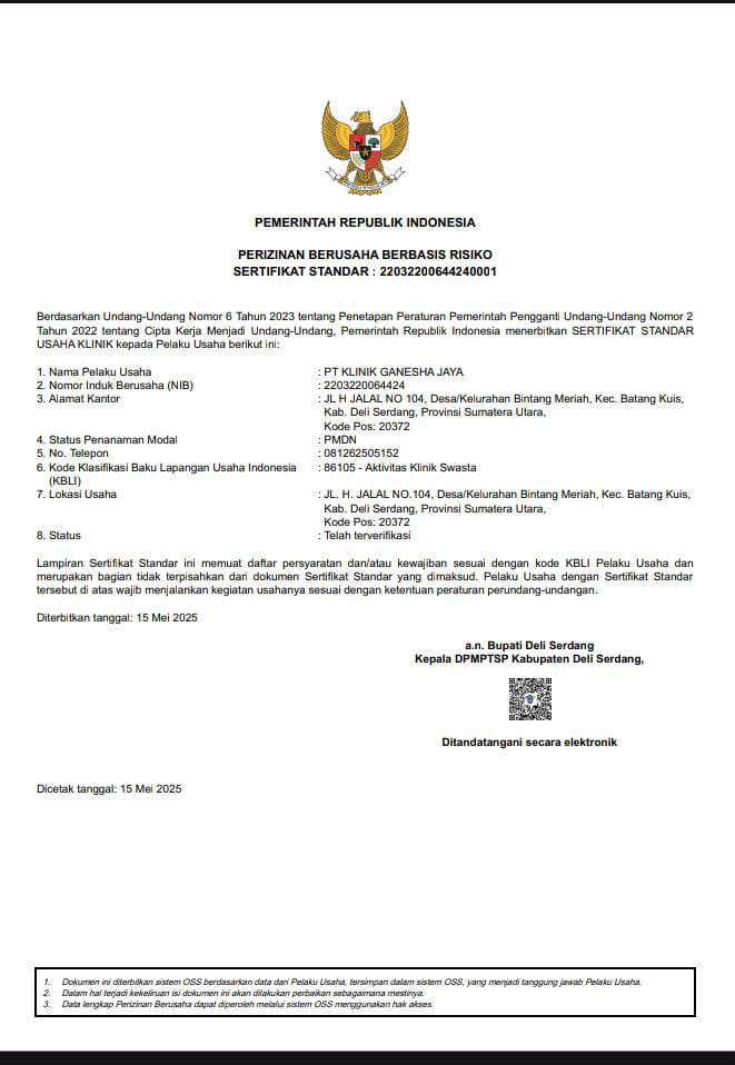 Klinik Ganesha memiliki ijin dan ijin tersebut mati tidak di perpanjang oleh pihak Klinik Ganesha terakhir mati ijin Klinik tersebut di bulan Febuari tahun 2024 ,saat ini di tahun 2025 bulan Februari telah melakukan pembuatan ijin kembali , memang saya sempat membuat surat peringatan pertama kedua dan ketiga dan saya sendiri yang mengantarkan surat peringatan tersebut ke pihak Klinik Ganesha