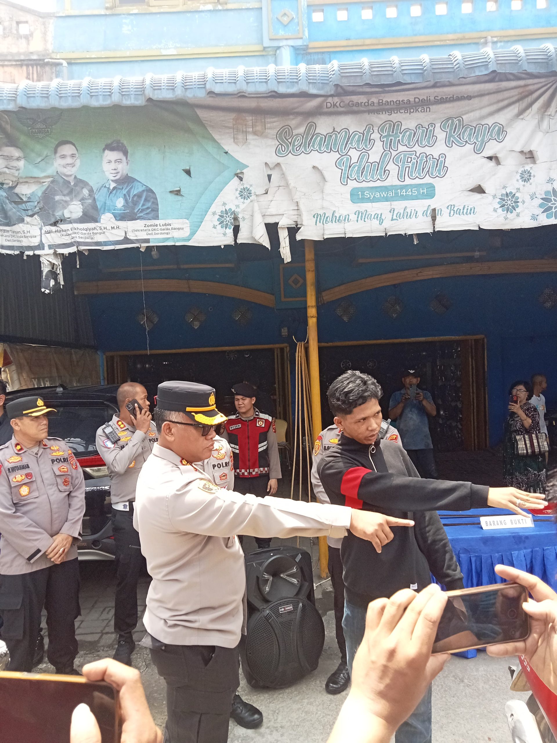 “Saat dilakukan penangkapan Reskrim Sunggal, cukup menarik dan jadi role model, kita melakukan patroli preventif straight, dengan sasaran menghentikan potensi tindak pidana. Saat patroli, melintas di daerah sini, ada sepeda motor spacy. Tersangka membawa sajam, ditaruh sajam nya dengan diapit. lalu dihentikan anggota, diperiksa. Setelah dikonfirmasi dan di cocokan dengan rekaman CCTV kita meyakini dia bagian dari pelaku yang melakukan begal di Binjai,” jelas Kombes Pol Dr Gidion Arif Setyawan.