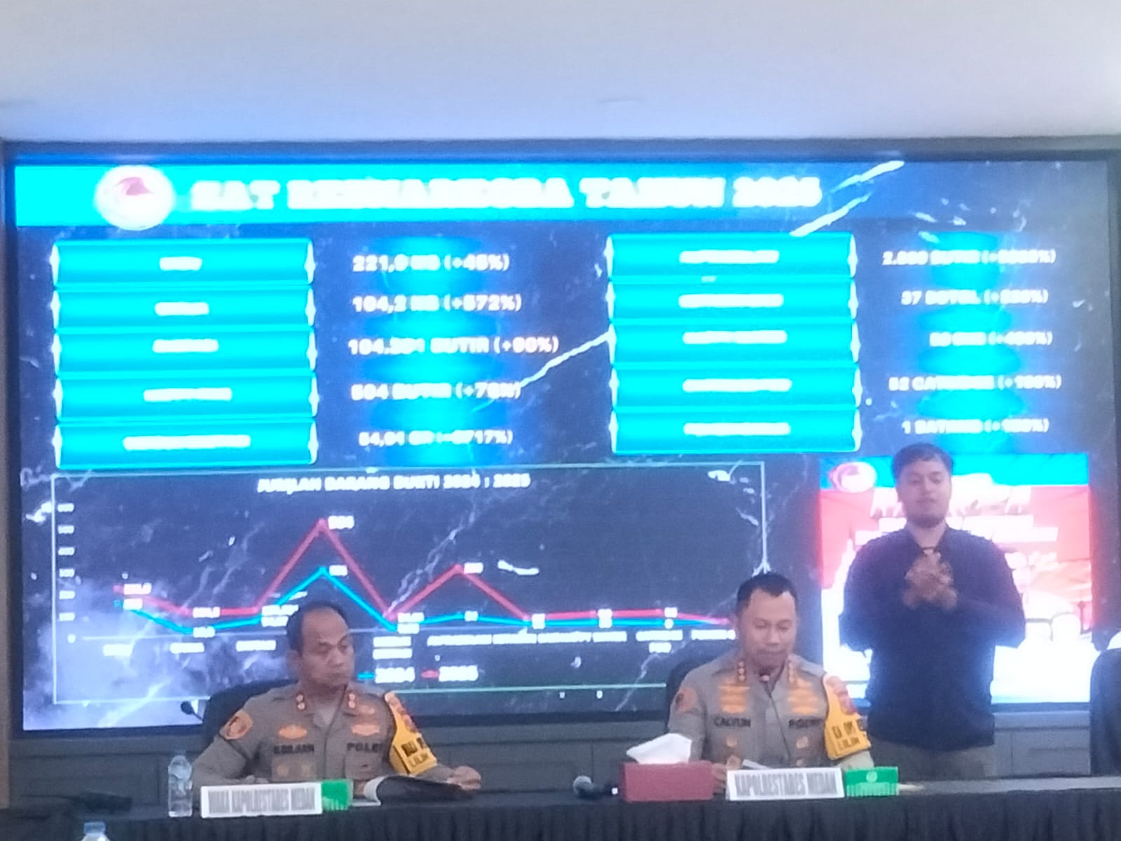 Di sisi lain, Polrestabes Medan mencatat peningkatan signifikan dalam penegakan hukum tindak pidana narkotika. Pengungkapan kasus narkoba meningkat sebesar 37 persen, penyelesaian perkara meningkat 11 persen, dan jumlah tersangka yang diamankan meningkat 36 persen dibandingkan tahun 2024.