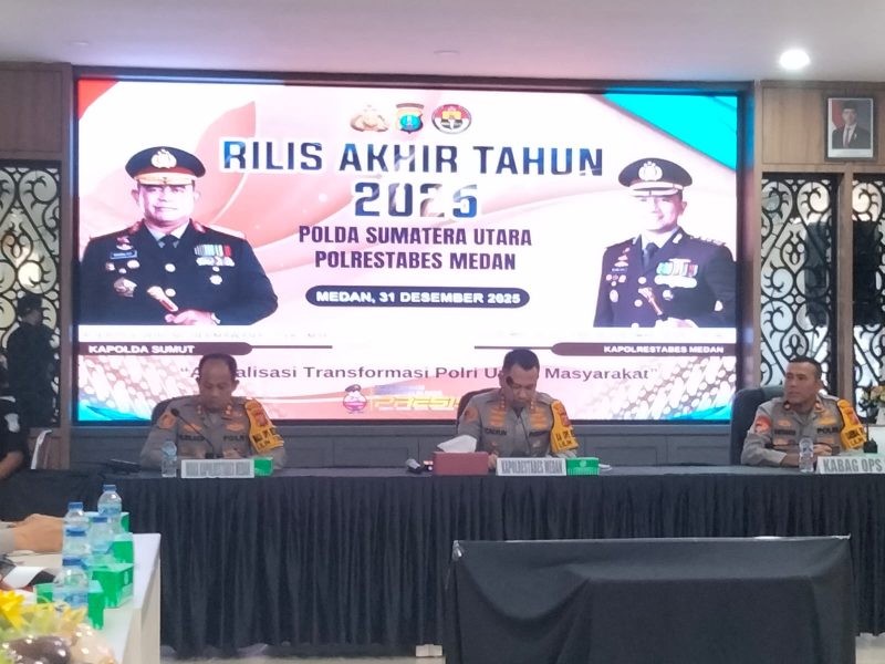 Polrestabes Medan menggelar Rilis Akhir Tahun 2025 di Aula Patriatama Polrestabes Medan, Rabu (31/12/2025), dengan mengusung tema “Aktualisasi Transformasi Polri untuk Masyarakat”.