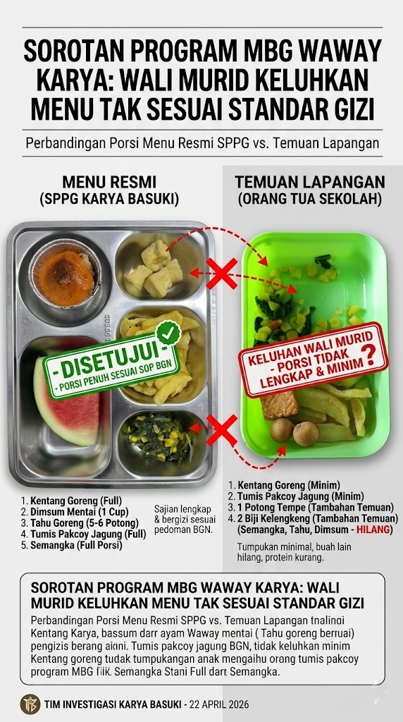 Berdasarkan laporan warga, keluhan ini mencuat pada pendistribusian makanan tertanggal 22 April 2026. Terdapat ketidaksesuaian antara menu yang ditetapkan dengan realitas porsi yang diterima siswa.